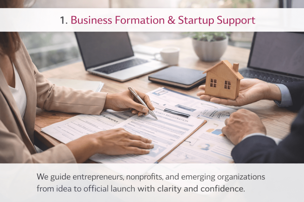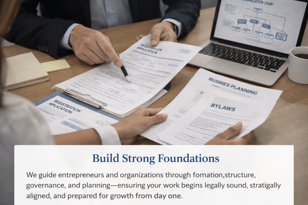 Business Formation & Startup Support – We guide entrepreneurs, nonprofits, and emerging organizations from idea to official launch with clarity and confidence. From business registration and structural setup to governance, planning, and compliance, we build the strong foundations required for long-term success. Our approach ensures your organization begins not only legally established, but strategically positioned to grow, secure funding, and operate sustainably.
