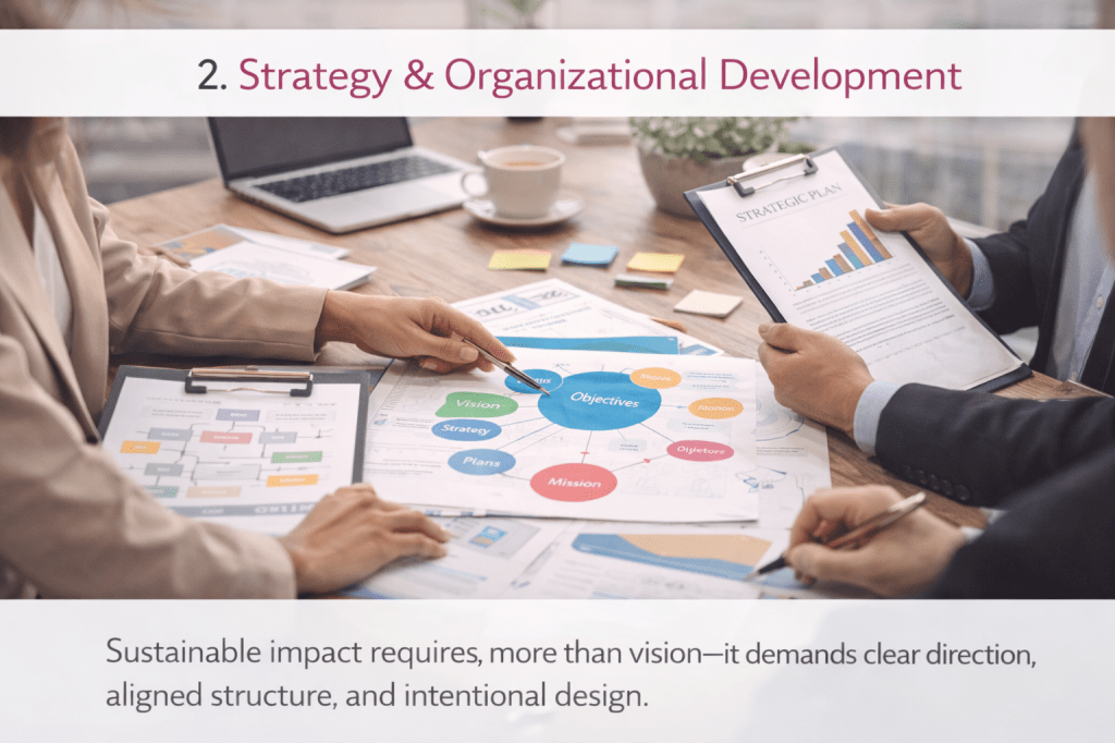 Strategy & Organizational Development – Sustainable impact requires more than vision, it demands clear direction, aligned structure, and intentional design. We partner with organizations to develop strategic plans, define programs and services, strengthen governance, and create operating models that support measurable growth. Through facilitated planning and practical implementation, we help organizations move from ideas to coordinated, high-functioning systems.