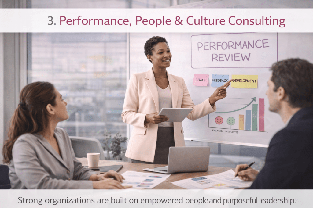 Performance, People & Culture Consulting – Strong organizations are built on empowered people and purposeful leadership. We design performance management systems, talent strategies, leadership development experiences, and culture-shaping initiatives that strengthen engagement, accountability, and long-term effectiveness. Our work integrates human insight with structured processes to ensure your people and performance evolve together.