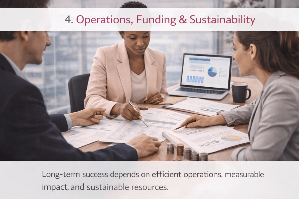 Operations, Funding & Sustainability – Long-term success depends on efficient operations, measurable impact, and sustainable resources. We support organizations in refining workflows, implementing monitoring and evaluation systems, strengthening reporting, and preparing for funding and partnerships. By aligning operations with strategy and impact, we help organizations scale responsibly and sustain meaningful growth over time.