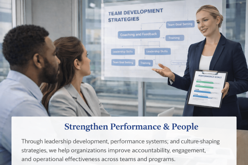 Through leadership development, performance systems, and culture-shaping strategies, we help organizations improve accountability, engagement, and operational effectiveness across teams and programs.