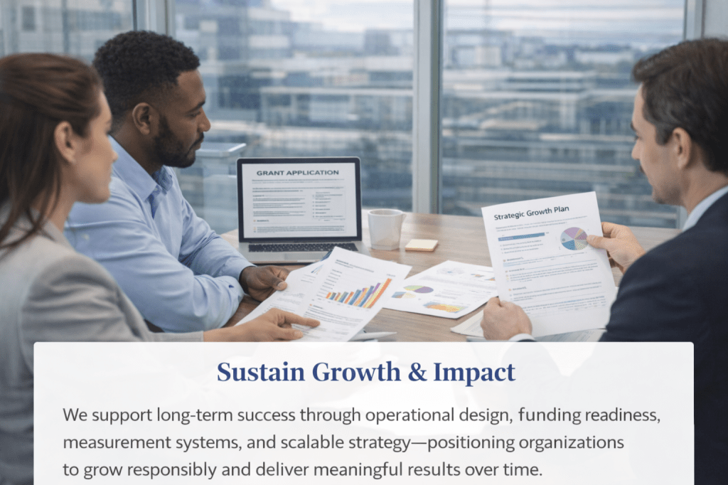 We support long-term success through operational design, funding readiness, measurement systems, and scalable strategy, positioning organizations to grow responsibly and deliver meaningful results over time.